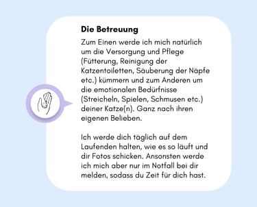 Ich erstelle dir auch gerne ein individuelles Angebot, sollte deine Katze besondere Bedürfnisse habe. Kontaktiere mich einfach für weitere Informationen :)